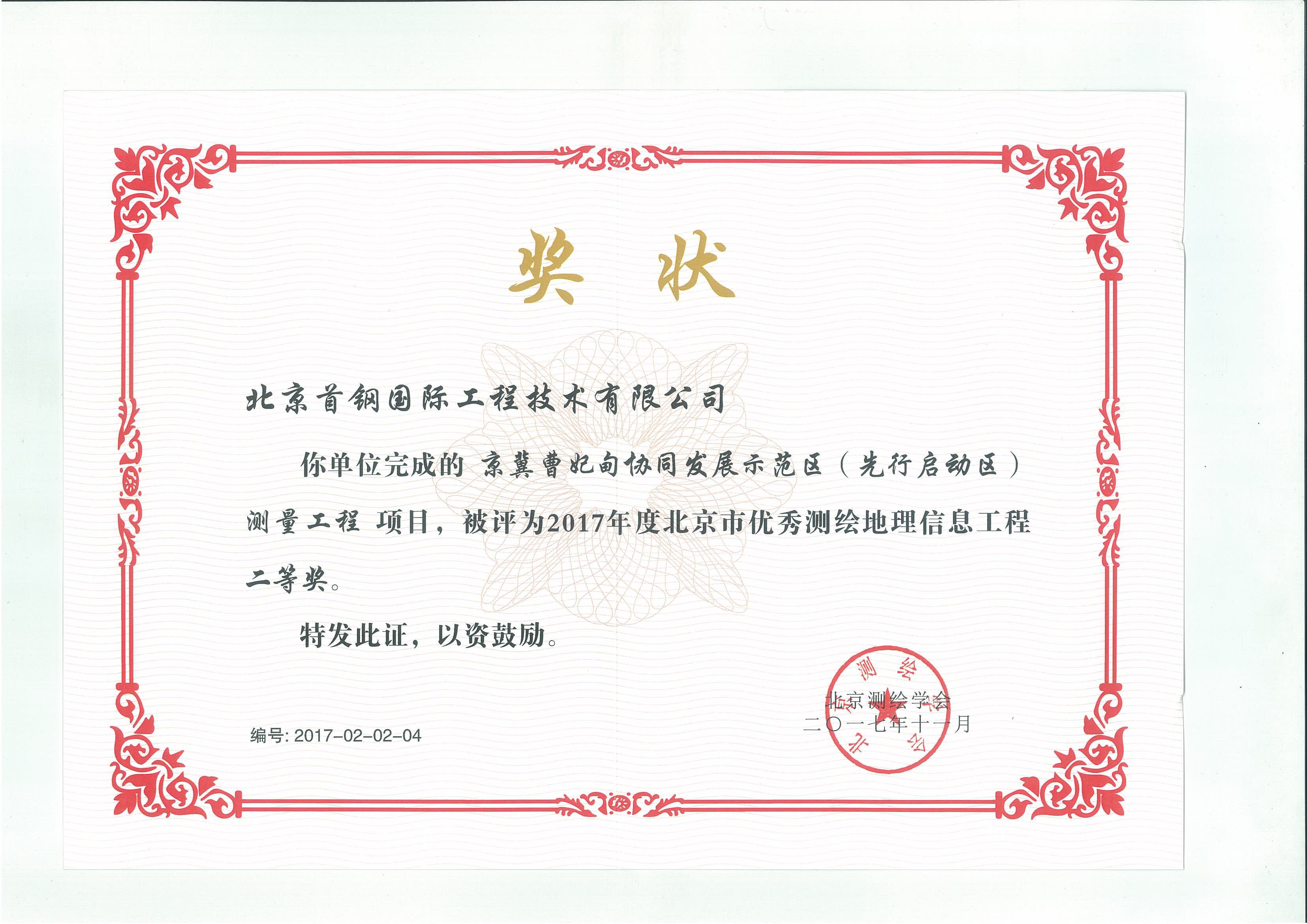 京冀曹妃甸協(xié)同協(xié)同發(fā)展示范區(qū)測量工程項(xiàng)目,21.4平方公里地形測繪,榮獲2017年度北京市優(yōu)秀測繪地理信息工程二等獎(jiǎng)。